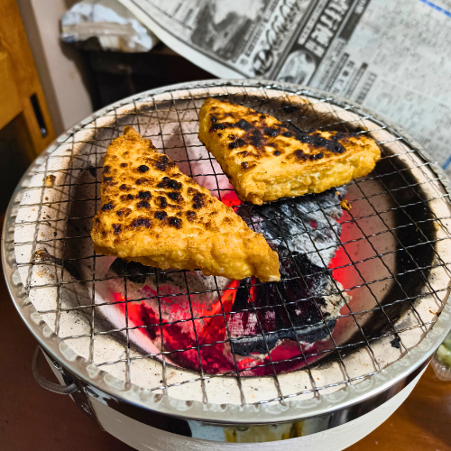 今回初めて、厚揚げを焼いてみました。これが本当にうまい!肉より貝より魚より感動しました。表面のサクサク感が最高です。ショウガ醤油にネギたっぷりで食べます。醤油をよく吸うので、追い醤油をします。旅行で買ってきた卓上の伊勢醤油が大活躍。